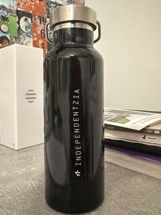 Botella de agua reutilizable de color negro con del gazte topagune de ernai. La tapa es de acero inoxidable con un asa para facilitar su transporte. - Color: Negro - Material de la tapa: Acero inoxidable