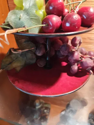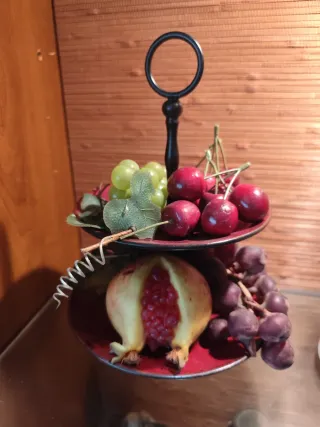 Elegante frutero de dos niveles con frutas artificiales que imitan a la perfección las reales. Altura 30 cm - Base y estructura de metal. - Frutas de plástico de alta calidad.