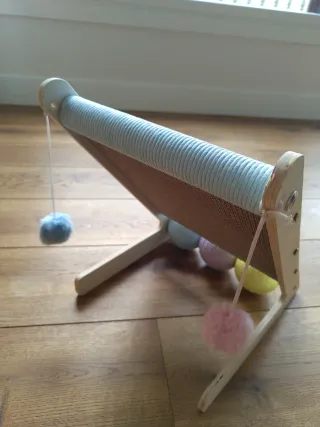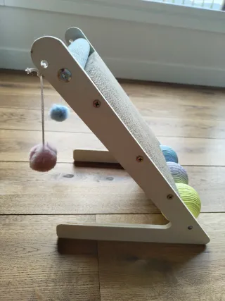 Rascador para gatos con diseño triangular y elementos de juego. - Superficie de cartón para afilar las uñas. - Incorpora un rodillo superior. - Incluye dos pelotas colgantes y tres apiladas para entretener. - Estructura de madera.