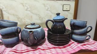 Precioso juego de té y café de cerámica. El juego incluye una tetera, una jarra lechera y seis tazas con sus platillos. Las piezas presentan un diseño único con tonos azules y negros, y lucen en excelente estado. - Tetera con tapa - Jarra lechera - Seis tazas - Seis platillos