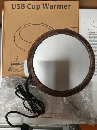 Este calentador de taza es perfecto para mantener tu bebida caliente. Su diseño combina un acabado de madera con una superficie plateada. - Funciona con conexión USB. - Diseño elegante y moderno.