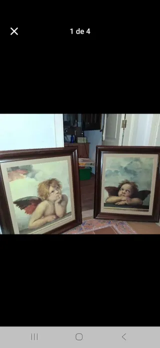 Conjunto de dos cuadros decorativos con marcos de madera. Precio por unidad - Medidas: 81 x 71 cm cada uno. - Motivo: Ángeles. - Marcos de madera. - Impresión sobre tela.