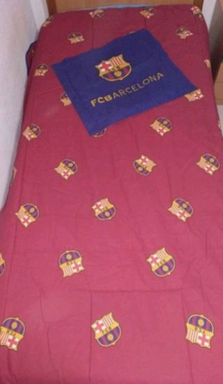 Edredón cama de 90 con el escudo y el nombre del FC Barcelona. Perfecto para los fans del equipo. - Diseño reversible. - Estampado del escudo del FC Barcelona. - Nombre del equipo FC BARCELONA en grande.