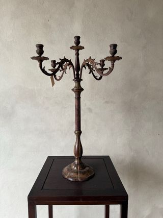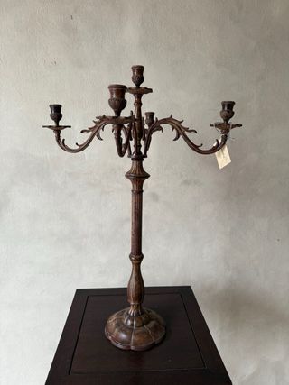 Elegante candelabro con un diseño clásico de cinco brazos. - Fabricado en latón. - Acabado en tonos marrones y dorados. - Base decorativa. - Detalles ornamentales en los brazos.