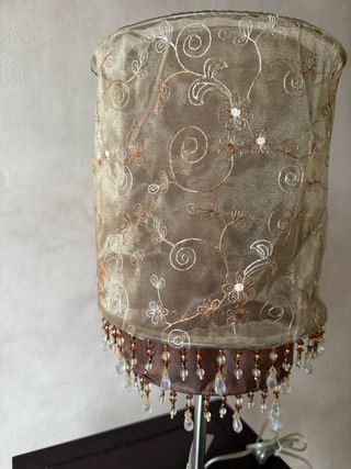 Elegante lámpara de mesa con un diseño único. Sus dimensiones son 52 cm de alto por 23 cm de ancho. - Pantalla de tela con detalles bordados. - Adornos de cuentas y abalorios en la parte inferior. - Base y pie de metal. - Acabado en tonos marrones y dorados.
