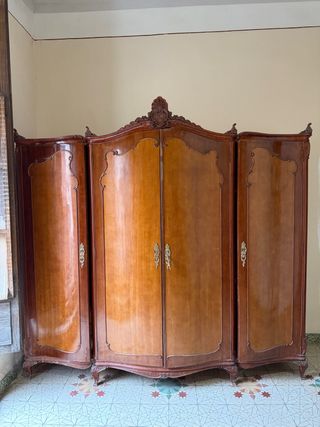 Armario de madera de gran tamaño con un diseño clásico y elegante. - Acabado en tonos marrones cálidos. - Puertas con detalles ornamentales. - Patas curvas con un estilo vintage.