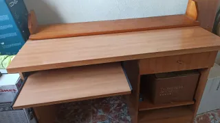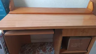 Mesa de escritorio con un diseño funcional y elegante. Ideal para tu espacio de trabajo o estudio. - Acabado en tono madera natural. - Incluye bandeja extraíble para teclado. - Compartimento de almacenamiento lateral. Recoger en Denia, se regala estantería del mismo color.Presenta algún roze.