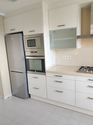 Conjunto de electrodomésticos de cocina en excelentes condiciones. - Frigorífico de gran capacidad. - Horno con panel digital. - Microondas integrado. - Muebles de cocina blancos con tiradores metálicos.