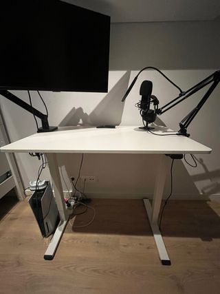 Escritorio eléctrico con superficie de trabajo espaciosa. - Medidas: 120cm de ancho x 60cm de profundidad. - Estructura metálica robusta. - Sobre Madera Blanco