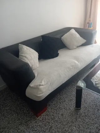 Urgente vendo Dos sofás de tres plazas con un diseño moderno y elegante. Combina la durabilidad del cuero con la comodidad de la tela. - Estructura principal en cuero negro. - Cojines decorativos en blanco y negro. - Funda de tela blanca para el asiento.