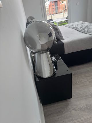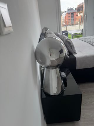 Elegante lámpara de diseño moderno de la marca Ideal Lux. Su acabado plateado le da un toque sofisticado. - Base y pantalla esférica. - Materiales de alta calidad. mide 4o cm alta y 22 cm diámetro