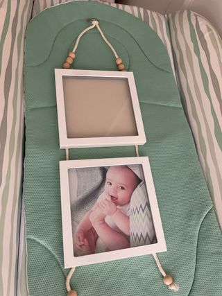Marco de fotos doble para colgar, con un diseño moderno y encantador. - Marco superior vacío. - Marco inferior con foto de bebé. - Cuerda con cuentas de madera para colgar. con pantalla de cristal
