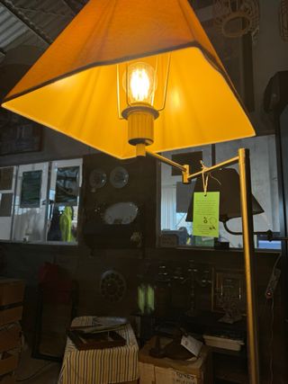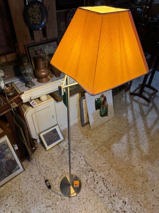 Elegante lámpara de pie con pantalla de tela. - Acabado en metal plateado. - Pantalla de tela en tono naranja vibrante.