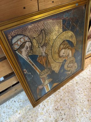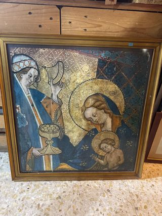 Precioso cuadro de temática religiosa con detalles en dorado. - Marco incluido. - Representación de la Virgen María con el Niño Jesús y un santo.