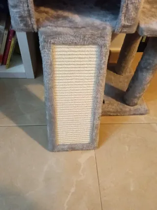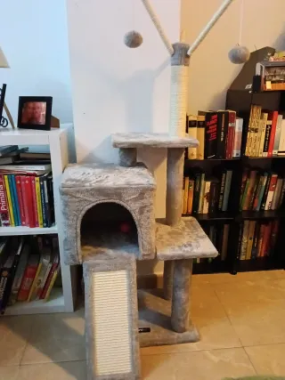 Rascador para gatos en perfecto estado, como nuevo. Ideal para que tu mascota juegue y descanse. - Diseño de varios niveles. - Incluye bolas colgantes para entretener. - Plataformas acolchadas. - Poste forrado de sisal para afilar las uñas. Mi gatito no lo quiere. Está acostumbrado a su mantita y a su rascador pequeño.