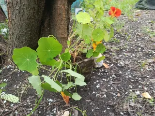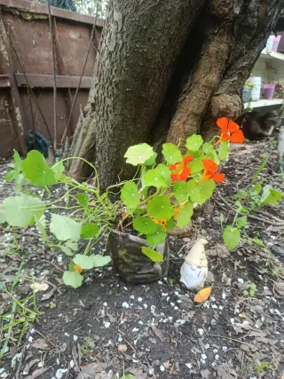 Planta de nasturtium en maceta, con vibrantes flores naranjas y amarillas - Flores comestibles