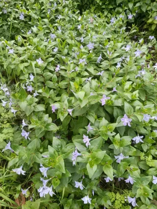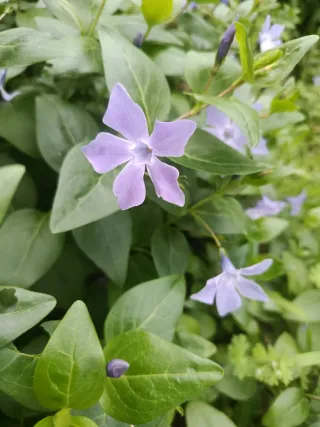 Planta natural con hermosas flores lilas y capullos. Vinca - Hojas verdes y brillantes. - Ideal para exteriores.