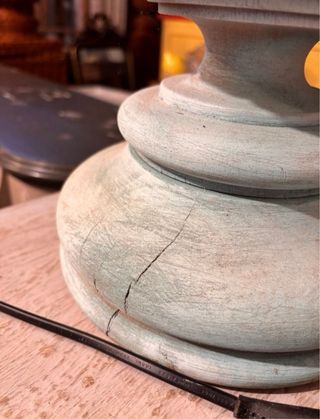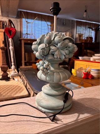 Pie de lampara tallado en madera. En las fotos se ven unas rajas. Tiene cable y boton de encendido. No se ha probado si funciona. El cabezal habría que ajustarlo ya que se mueve.