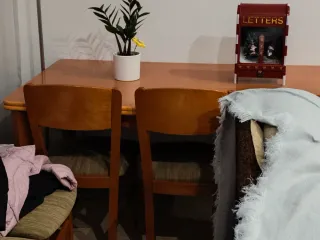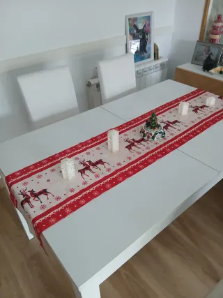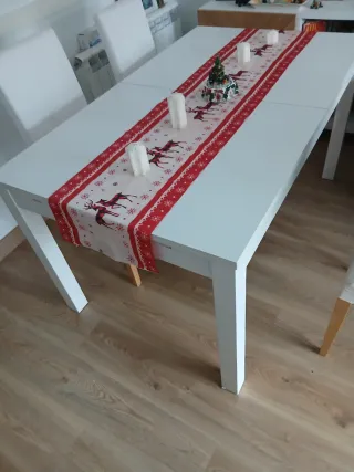 Mesa de comedor de diseño moderno y elegante, perfecta para cualquier hogar. Su acabado blanco aporta luminosidad y amplitud a tu espacio. Tiene una pequeña mancha de pegamento que se puede apreciar en la tercera foto. Tiene dos láminas para abrirla hasta 80cm más (40cm cada una). Se regalan dos sillas a juego. - Extensible para mayor capacidad. - Patas robustas para mayor estabilidad.
