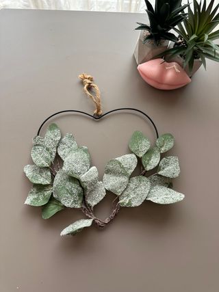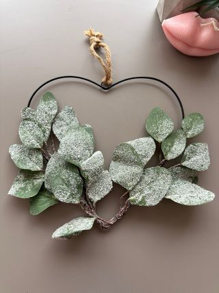Precioso adorno en forma de corazón con un diseño de hojas verdes cubiertas de escarcha. - Estructura metálica. - Hojas de tela.