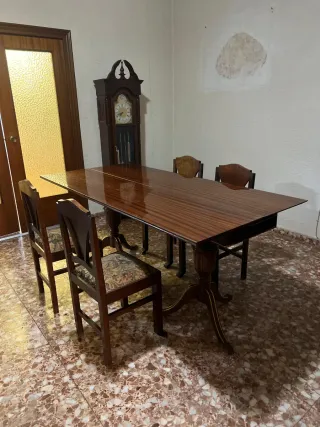 Conjunto de mesa libro antigua de estilo clásico con patas torneadas tipo pedestal, con cuatro sillas de madera a juego con asiento tapizado. Medidas: Abierta: 185 cm (largo) x 90 cm (ancho) Cerrada: 45 cm (ancho) Estado: muy buena estructura, no está rota. La mesa abre y cierra perfectamente, es totalmente funcional y estable en su uso diario. Tiene desgaste superficial del barniz/pintura en algunas zonas debido a los años (propio de muebles vintage), sin afectar en absoluto a su funcionamiento ni a su solidez.