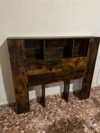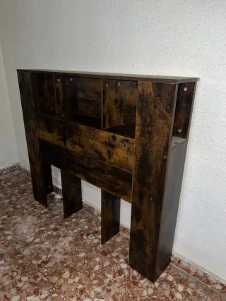 Cabecero de cama con acabado en roble ahumado. Sus dimensiones son 120 cm de ancho, 18,5 cm de fondo y 104,5 cm de alto. Diseño moderno con compartimentos.