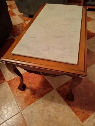 Elegante mesa de centro con un diseño clásico. - Tablero superior de mármol blanco con vetas grises. - Base y patas de madera con acabado en tono marrón cálido. - Patas curvas con un estilo decorativo.