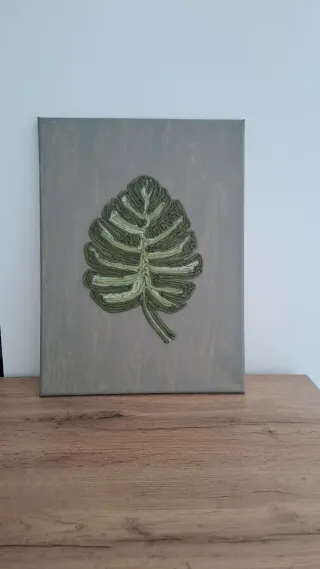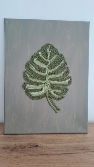 Decoración de pared con diseño de hoja de Monstera. - Elaborado con tela. - Tonos verdes y grises. - Base de pintura acementada.