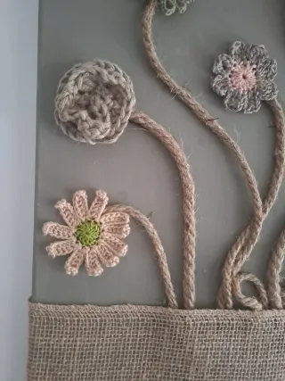 Bonito cuadro decorativo con un diseño rústico y original. - Flores hechas a mano con técnica de crochet. - Tallos y detalles en cuerda de yute. - Base de tela sobre lienzo. - Tonos beige y verdes que aportan calidez.