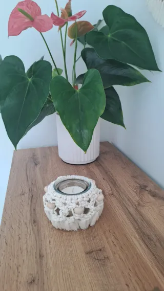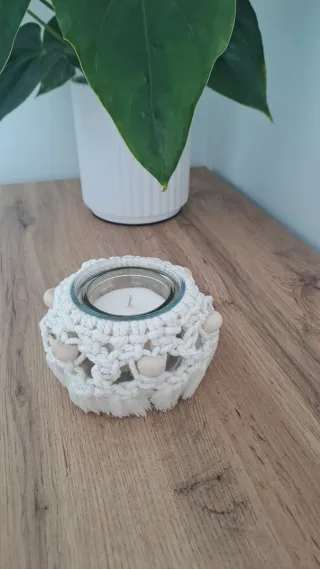 Portavelas Macramé Blanco y Madera