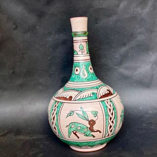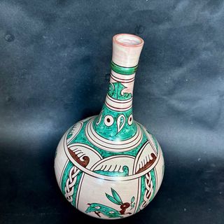 Jarrón artesanal con un diseño inspirado en el arte califal del siglo X. Su forma y decoración lo convierten en una pieza única. - Altura aproximada de 30 cm. - Acabado en tonos beige y verde. - Elaborado en cerámica. - Solo recogida