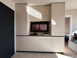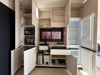 Conjunto de cocina en tonos neutros, ideal para espacios modernos. - Diseño modular. - Acabados elegantes. - Todo incluido. - Frigorífico integrado. - Grifería en negro.