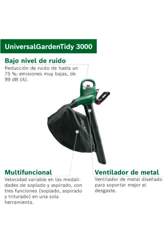 Aspirador de hojas Bosch en color verde y negro, con accesorios para su uso. - Incluye bolsa de recolección Bosch. - Tubo de aspiración. - Correa de transporte.