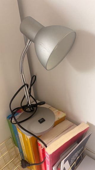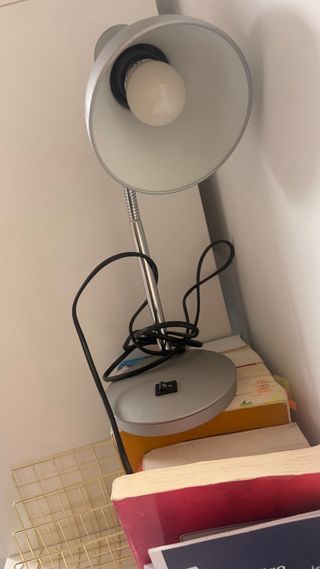 Flexo de escritorio con un diseño moderno y funcional. Ideal para iluminar tu espacio de trabajo o estudio. - Acabado en color plateado. - Base redonda y brazo flexible para ajustar la luz. - Interruptor en la base para encendido y apagado.
