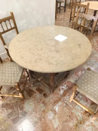 4 Mesas redondas madera y cristal. Cada mesa, 70€.