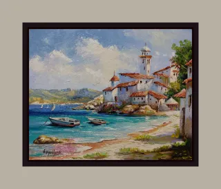 Preciosa pintura al óleo de un paisaje marino con un pueblo costero y barcos. Pieza #5 de la colección "Paisajes luminosos". Una serie dedicada a la hermosa luz del Mediterráneo. - Técnica: Óleo sobre lienzo. - Motivo: Pueblo costero con barcas. - Estilo: Realista con acentos de espátula que le dan unos hermosos toques impresionistas. Formato más accesible de una serie mediterránea, pensada para espacios luminosos y decoración elegante. *El marco es ilustrativo, no está incluido en el precio expuesto. Si se desea un marco artesanal, tipo caja americana, consultarlo antes en el apartado de mensajes.