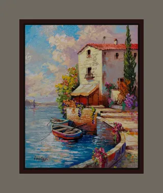 Preciosa pintura al óleo de un paisaje marino con un pueblo costero y barcos. Pieza #2 de la colección "Paisajes luminosos". Una serie dedicada a la hermosa luz del Mediterráneo. - Técnica: Óleo sobre lienzo. - Motivo: Pueblo costero con fachadas de casas, mar y barcos. - Estilo: Realista con acentos de espátula que le dan unos hermosos toques impresionistas. Formato más accesible de una serie mediterránea, pensada para espacios luminosos y decoración elegante. *El marco es ilustrativo, no está incluido en el precio expuesto. Si se desea un marco artesanal, tipo caja americana, consultarlo antes en el apartado de mensajes.
