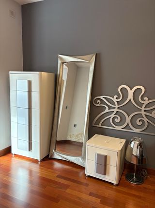 Se vende dormitorio completo con un diseño moderno y elegante. Incluye: Cómoda blanca de líneas rectas en perfecto estado. Ancho 60 Fondo 40 Altura 140 Cabecero 110x66cm plateado y perchero a juego para cama de 105cm Espejo cuerpo entero Ancho 63 Altura 170cm Lámpara de sobremesa con pantalla metálica. D 24cm Altura 60 Butaca transparente (tiene un defecto en el asiento) Lampara techo D60 Colcha de cama de 105cm con cojines (incluidos los rellenos) De regalo mesita de noche que tiene un desperfecto en la parte de arriba y una silla de escritorio a juego. La recogida se haría en el domicilio, no se envía