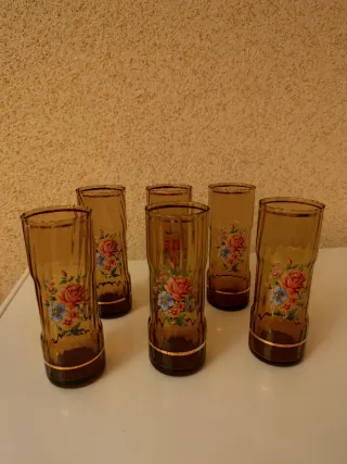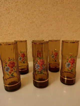 Conjunto de seis vasos altos de cristal color ámbar con un diseño floral. - Diseño vintage con motivos florales. - Borde dorado en la parte superior e inferior. - Color ámbar translúcido.