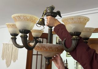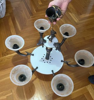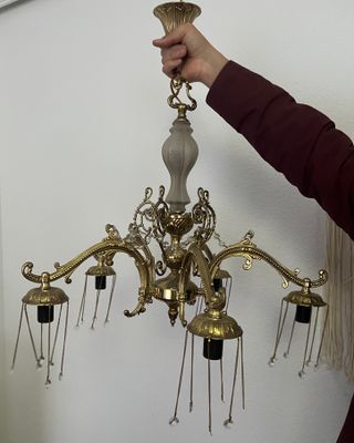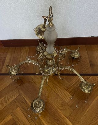Elegante lámpara de araña con cinco brazos y detalles de cristal. - Estructura principal en bronce. - Adornos colgantes de cristal transparente. - Diseño clásico y ornamentado.