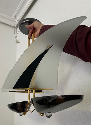 Lámpara de diseño con forma de velero, combinando metal y cristal. - Acabado en negro y dorado. - Detalles en cristal tallado en la base.