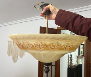 Elegante plafón con detalles en bronce y acabado en alabastro. Su diseño aporta un toque clásico a cualquier estancia. - Materiales: metal y vidrio. - Colores: beige y dorado.