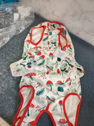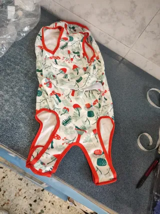 Traje de recuperación para perros tras cirugía. Diseñado para brindar comodidad y protección. Dispone de cinturón con velcro para ajustar. Corchetes en la zona trasera - Estampado de setas y hojas. - Ribete rojo en cuello y patas. - Tejido suave y transpirable. Medidas aproximadas: Cuello 55cm Pecho 73cm Largo 50cm