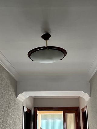 Elegante lámpara de techo con un diseño clásico y acabados en madera oscura. Perfecta para pasillos o recibidores. - Aro exterior de metal - Difusor de cristal opal.