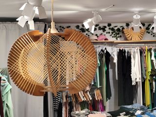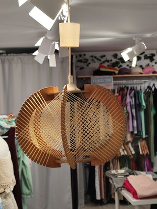 Lámpara colgante con un diseño único y moderno. - Estructura principal de madera. - Detalles en plástico. - Tonos beige y marrón.