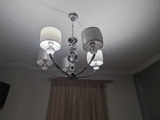 Elegante lámpara de techo con un diseño moderno y sofisticado. - Acabado en metal plateado. - Pantallas de tela en tono beige. - Detalles en cristal. - Estructura de metal.