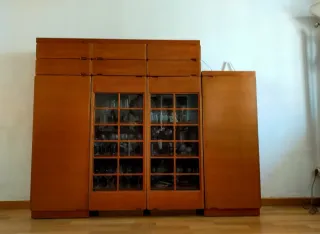 Armario estantería modular con un diseño moderno y funcional. - Acabado en tonos madera y beige. - Estructura combinada de madera y plástico.