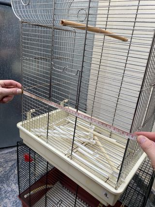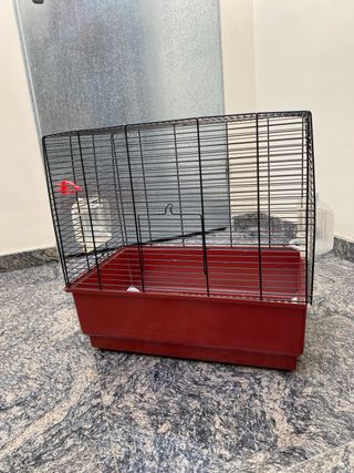 Jaula para pájaros con base roja y estructura de alambre negro. - Bandeja extraíble para facilitar la limpieza. - Puerta frontal con cierre de seguridad. - Incluye bebedero.