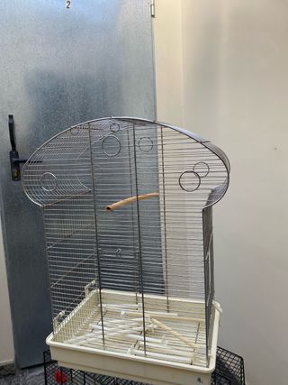 Jaula para pájaros con un diseño curvo en la parte superior. - Bandeja extraíble para facilitar la limpieza. - Incluye dos perchas de madera. - Estructura de alambre resistente.