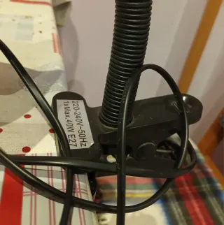 Lámpara de techo con un diseño moderno y materiales combinados. - Base circular de madera. - Cuerpo principal de plástico gris. - Cables de conexión visibles. - Nuevas, sin estrenar. - Lamparas led, 3 grises y 1 rosa. - 10 euros cada una.